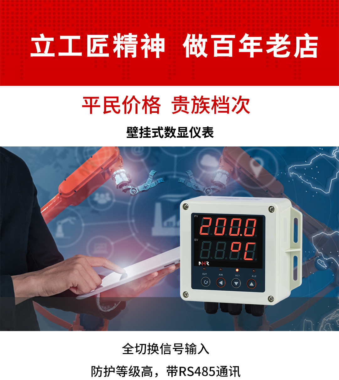 虹潤公司是專業(yè)生產(chǎn)數(shù)顯表的國家專精特新“小巨人”企業(yè),生產(chǎn)的壁掛式數(shù)顯儀表,具有全切換信號輸入,高抗干擾,IP65防護等級,全隔離設(shè)計,變送輸出或RS485通訊等特點。產(chǎn)品獲得巡回檢測顯示方法及裝置、一種儀表電源等2項國家發(fā)明專利,主持起草工業(yè)過程控制系統(tǒng)用模擬輸入兩位或多位輸出儀表、物聯(lián)網(wǎng)智能溫度儀表通用技術(shù)條件等2項國家標準,,以及通信系統(tǒng)多通道數(shù)據(jù)采集控制終端規(guī)范軍用標準,參與國際5G標準制定,取得簡易數(shù)顯儀表等3項相關(guān)軟件著作權(quán)。產(chǎn)品廣泛應(yīng)用于電力、石化、冶金、化工、造紙、食品、輕工、制藥、熱處理、水處理、機械配套等各種工業(yè)現(xiàn)場。