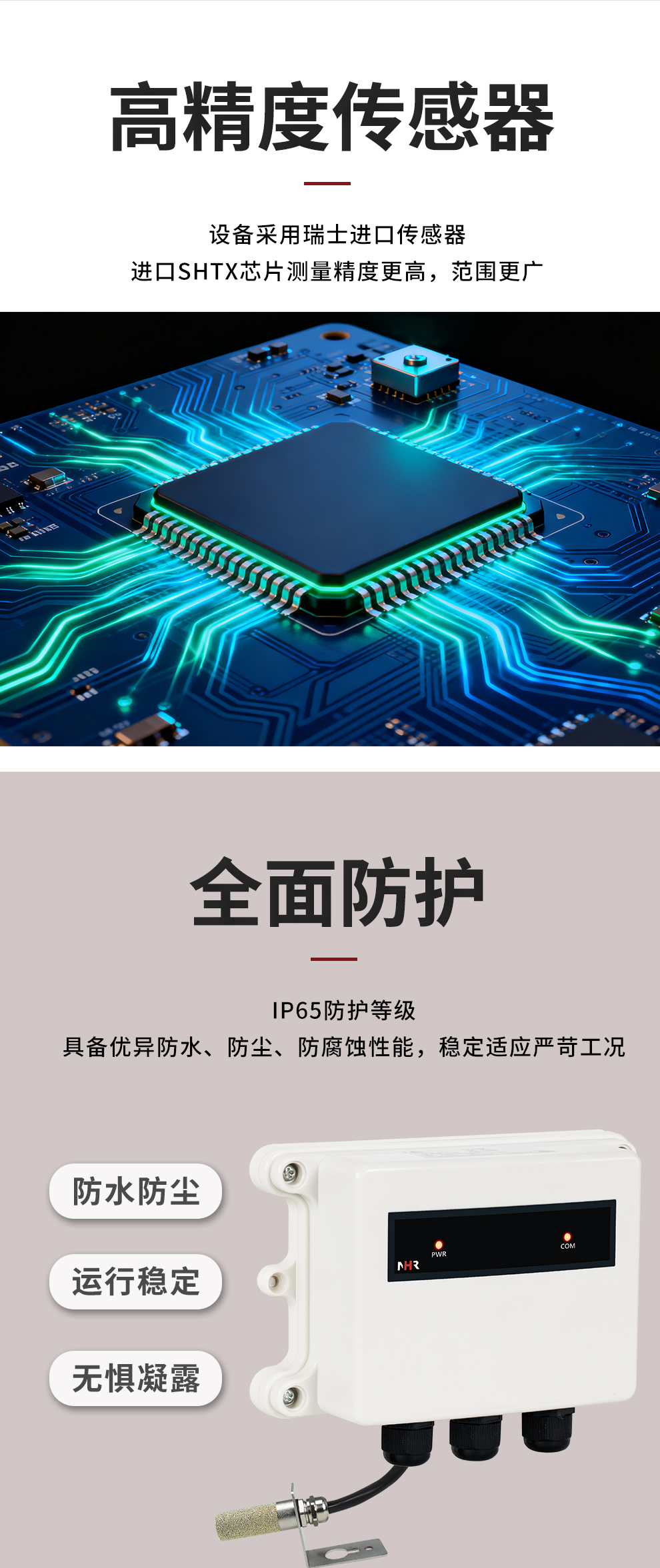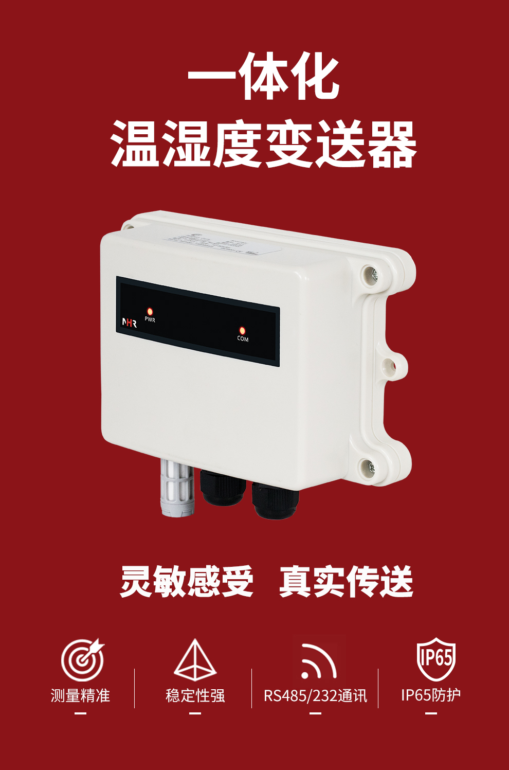 虹潤公司是專業(yè)生產(chǎn)環(huán)境監(jiān)測儀表的國家專精特新“小巨人”企業(yè)。生產(chǎn)的一體式溫濕度變送器,具有溫度、濕度、露點(diǎn)高精準(zhǔn)的測量與變送,報(bào)警繼電器輸出,RS485/RS232通訊,IP65防護(hù)等級(jí)等特點(diǎn)。產(chǎn)品獲得一種手持式低功耗溫濕度檢測儀、大屏幕溫濕度記錄儀等2項(xiàng)國家發(fā)明專利,主持起草物聯(lián)網(wǎng)智能溫度儀表通用技術(shù)條件、冷鏈溫度記錄儀等2項(xiàng)國家標(biāo)準(zhǔn),以及通信系統(tǒng)多通道數(shù)據(jù)采集控制終端規(guī)范軍用標(biāo)準(zhǔn),以及現(xiàn)場設(shè)備集成等5項(xiàng)智能制造國家標(biāo)準(zhǔn),參與國際5G標(biāo)準(zhǔn)制定,取得溫濕度儀表等3項(xiàng)相關(guān)軟件著作權(quán)。產(chǎn)品廣泛應(yīng)用于工業(yè)現(xiàn)場、農(nóng)業(yè)大棚、倉儲(chǔ)物流、地下管廊、養(yǎng)殖孵化、配電機(jī)房等諸多領(lǐng)域。