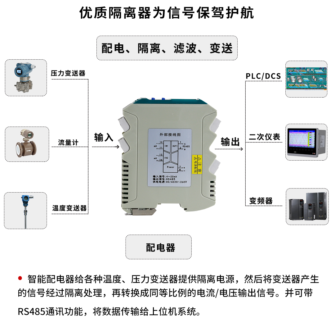 虹潤公司是專業(yè)生產(chǎn)隔離器的國家專精特新“小巨人”企業(yè)。生產(chǎn)的導(dǎo)軌式智能配電器,具有配接二三線制變送器,輸入輸出電源三隔離,響應(yīng)時(shí)間快,傳輸精度0.1%FS,支持485通訊輸出等特點(diǎn)。產(chǎn)品獲得信號隔離器、一種二端子模塊、無源信號隔離器等3項(xiàng)國家發(fā)明專利,主持起草現(xiàn)場設(shè)備工具(FDT)接口規(guī)范、工業(yè)過程測量和控制系統(tǒng)用隔離式安全柵、工業(yè)過程測量和控制系統(tǒng)用配電器等3項(xiàng)國家標(biāo)準(zhǔn),以及通信系統(tǒng)多通道數(shù)據(jù)采集控制終端規(guī)范軍用標(biāo)準(zhǔn)。參與國際5G標(biāo)準(zhǔn)制定。,取得智能隔離器等2項(xiàng)相關(guān)軟件著作權(quán)。產(chǎn)品廣泛應(yīng)用于石油、化工,冶金、電力、食品、光伏能源、污水處理等需要電隔離的工業(yè)自動(dòng)化控制系統(tǒng)。
