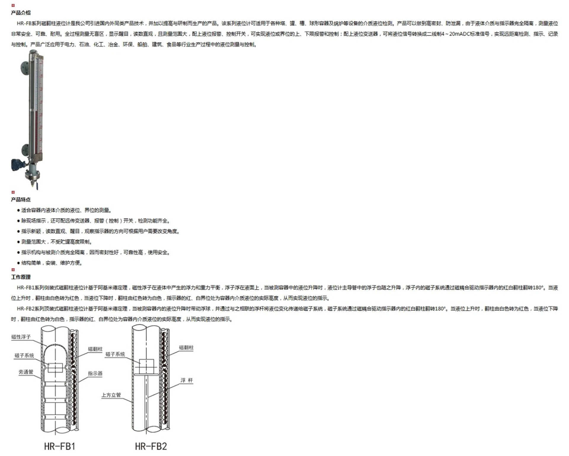 HR-FB系列磁翻柱液位計是我公司引進國內(nèi)外同類產(chǎn)品技術,并加以提高與研制而生產(chǎn)的產(chǎn)品。該系列液位計可適用于各種塔、罐、槽、球形容器及鍋爐等設備的介質液位檢測。產(chǎn)品可以做到高密封、防泄漏,由于液體介質與指示器完全隔離,測量液位非常安全、可靠、耐用。