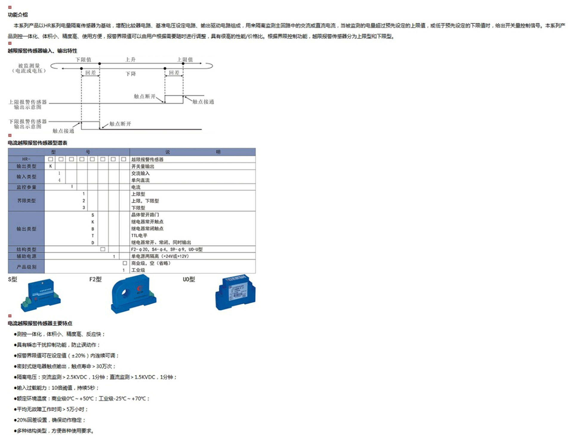 電流越限報警傳感器以HR系列電量隔離傳感器為基礎(chǔ),增配比較器電路、基準電壓設(shè)定電路、輸出驅(qū)動電路組成,用來隔離監(jiān)測主回路中的交流或直流電流,當被監(jiān)測的電量超過預(yù)先設(shè)定的上限值,或低于預(yù)先設(shè)定的下限值時,給出開關(guān)量控制信號。
